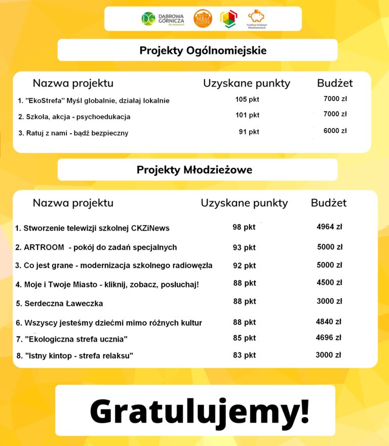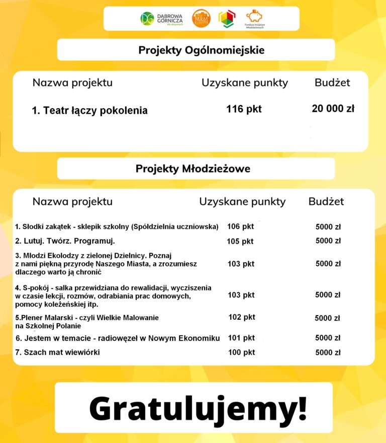Gratulujemy wszystkim zwycięzcom i już nie możemy doczekać się realizacji waszych projektów😁 Po krótce opiszemy wam czym właściwie są poniższe inicjatywy Projekty Ogólnomiejskie: 1. "Ze Sztuką do Młodzieży"- to projekt podczas, którego grupy i koła teatralne z Miasto Dąbrowa Górnicza wezmą udział w cyklu szkoleń teatralnych a całość projektu zwieńczy parada teatralna🎭 Projekty Młodzieżowe: 1. "Karnawał po Królewsku"- to bal przygotowany przez uczniów II Liceum Ogólnokształcące im. Stefana Żeromskiego w Dąbrowie Górniczej dla dzieci i młodzieży ze Specjalnego Ośrodka Szkolno-Wychowawczy w Dąbrowie Górniczej. Uczniowie SOSW będą mogli poczuć się jak na pięknym wręcz filmowym królewskim balu❤ 2. "Akademia Młodego Aktywisty" to kilku dniowy cykl szkoleń z aktywności społecznej skierowany do młodzieży. Podczas projektu aktywiści miejscy będą zachęcać młodzież do aktywności społecznej a po zakończeniu szkoleń sami wypracują własną inicjatywę, którą zrealizują wraz z prowadzącymi😉 3. "Otulić Starość Młodością"- jak sama nazwa wskazuje projekt ma na celu zintegrowanie młodzieży z naszymi dąbrowskimi seniorami. Uczniowie Szkoły Podstawowej nr 29 przygotują cykl spotkań integracyjnych podzczas, których będą odbywały się przeróżne warsztaty😜 4. "Rozwój Szkolnego Klubu Wolontariusza- Prosto z Serca"- chyba wszyscy wiemy jak istotny szczególnie w dzisiejszych czasach jest wolontariat. Uważamy, że trzeba wspierać osoby, które chcą czynić dobro a w tym przypadku tych dobrych dusz jest blisko 80🥰 5. "Cykl Szkoleń MONTESSORI"- czyli rodzice z dziećmi na macie, pieniążki w tym wypadku będą przeznaczone na organizacje zajęć dla rodziców z dziećmi, co z pewnością wzmocni ich więzi a przy nauczą się samoobrony🥋 6. "Różowa Skrzyneczka"- czasem może zabraknąć środków higienicznych a w pobliżu nie ma pomocnej dłoni, nic prostrzego, wystarczy zamontować w szkole różową skrzyneczkę☺️ 7. "Kuchnia Pełna Niespodzianek"- uczniowie Zespół Szkół Plastycznych w Dąbrowie Górniczej już nigdy nie będą odczuwać głodu w szkole, nawet jeśli zabraknie im kanapki to w kuchni z pewnością znajdą coś dla siebie albo odgrzeją swój posiłek. Doskonale wiemy że zajęcia od 8 do 17 są wymagające, dobrze wrzucić coś na ząb w trakcie tak długiego dnia😀 🏆Jeszcze raz serdeczne gratulacje🏆