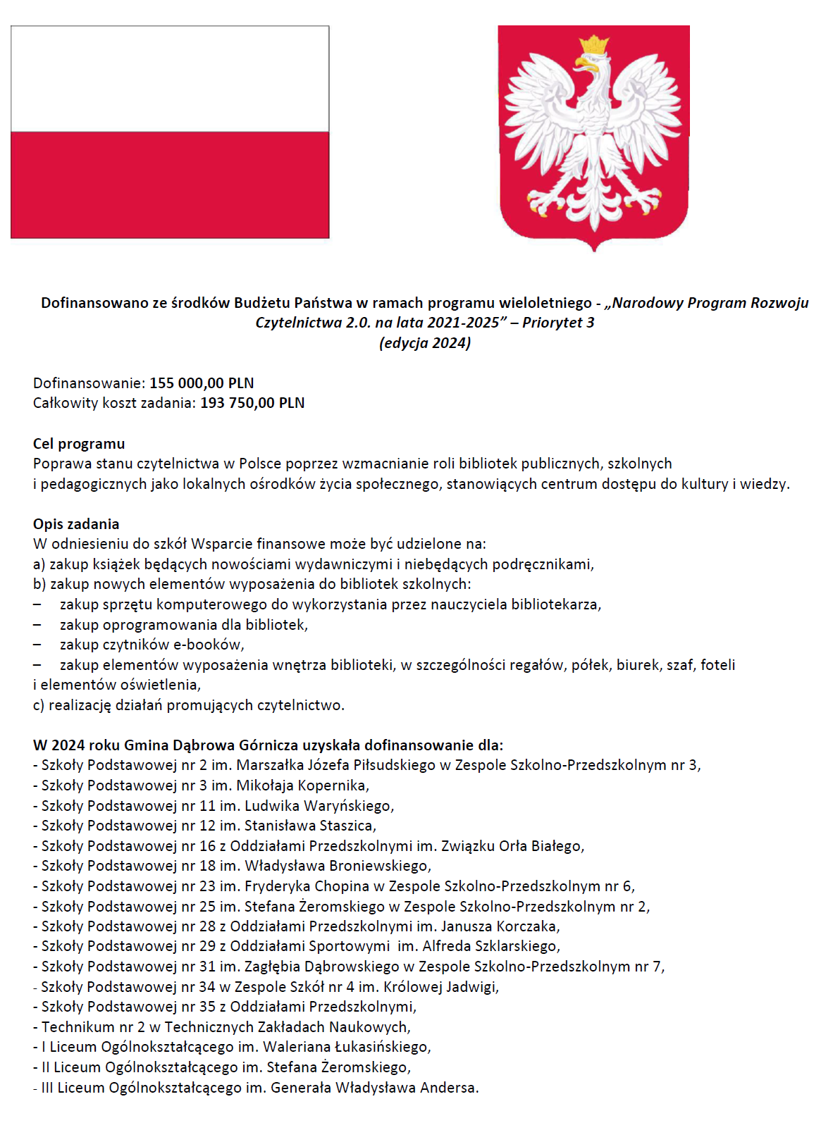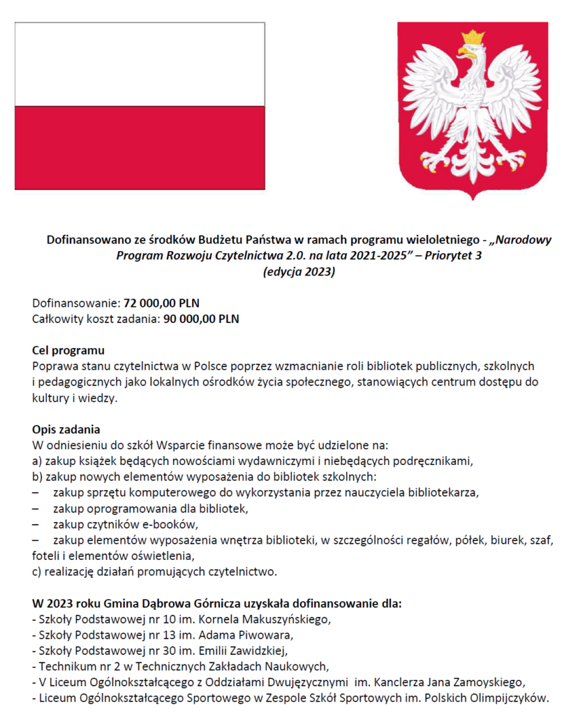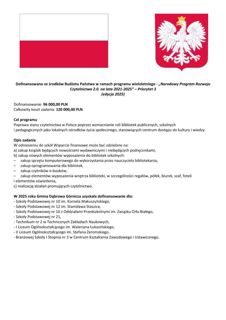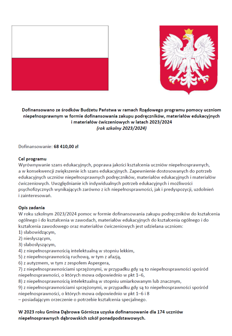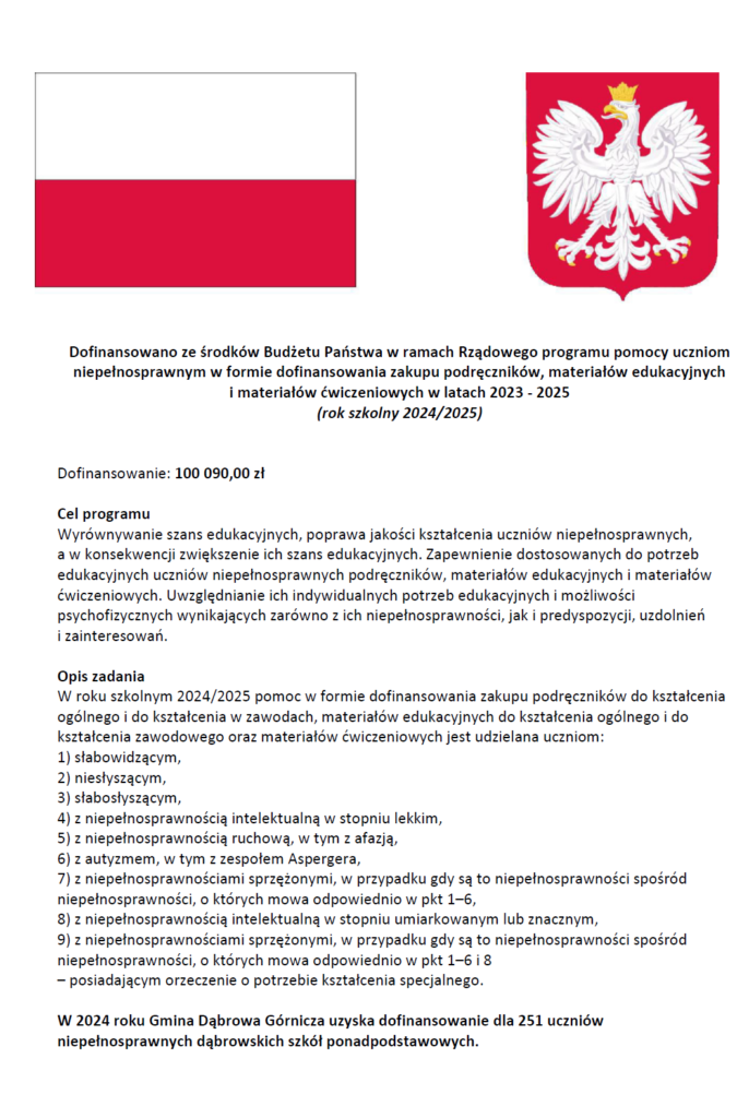 Wydział Oświaty Urzędu Miejskiego w Dąbrowie Górniczej informuje, że uczniowie dąbrowskich szkół ponadpodstawowych posiadający orzeczenie o potrzebie kształcenia specjalnego są uprawnieni do skorzystania z „Rządowego programu pomocy uczniom niepełnosprawnym w formie dofinansowania zakupu podręczników, materiałów edukacyjnych i materiałów ćwiczeniowych w latach 2023-2025.”