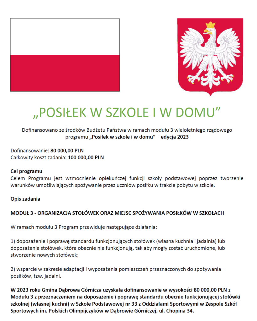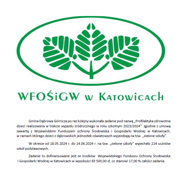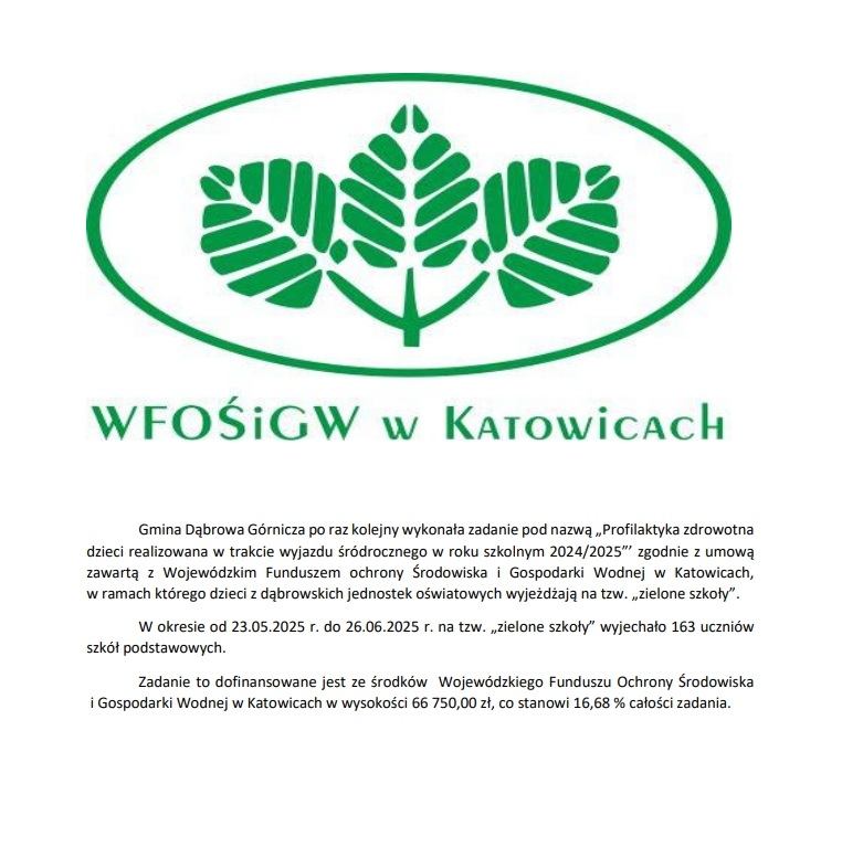 Gmina Dąbrowa Górnicza po raz kolejny wykonała zadanie pod nazwą „Profilaktyka zdrowotna dzieci realizowana w trakcie wyjazdu śródrocznego w roku szkolnym 2022/2023”’ zgodnie z umową zawartą z Wojewódzkim Funduszem ochrony Środowiska i Gospodarki Wodnej w Katowicach, w ramach którego dzieci z dąbrowskich jednostek oświatowych wyjeżdżają na tzw. „zielone szkoły”. W okresie od 02.06.2023 r. do 19.06.2023 r. na tzw. „zielone szkoły” wyjechało 166 uczniów szkół podstawowych. Zadanie to dofinansowane jest ze środków Wojewódzkiego Funduszu Ochrony Środowiska i Gospodarki Wodnej w Katowicach w wysokości 64 000,00 zł, co stanowi 17,59 % całości zadania.