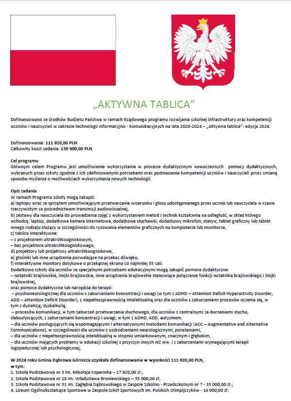 W 2022 roku jest realizowana kolejna edycja Rządowego programu rozwijania szkolnej infrastruktury oraz kompetencji uczniów i nauczycieli w zakresie technologii informacyjno-komunikacyjnych „Aktywna tablica” na lata 2020-2024.